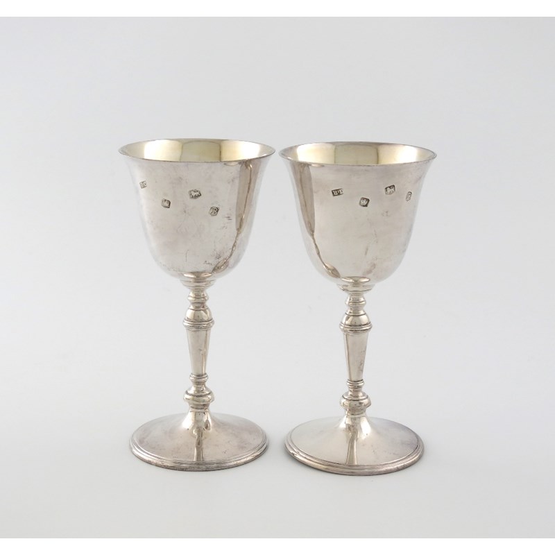 urn shaped bowls, gilded interiors, on knopped baluster stems on raised circular bases, height 14.5cm, approx. weight 12.5oz. (2)