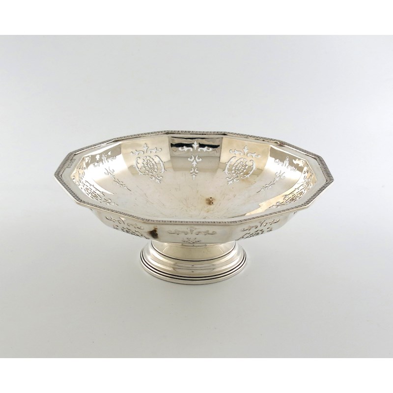 panelled circular form, gadroon border, pierced decoration, on a raised circular foot, diameter 21.7cm, approx. weight 11oz.