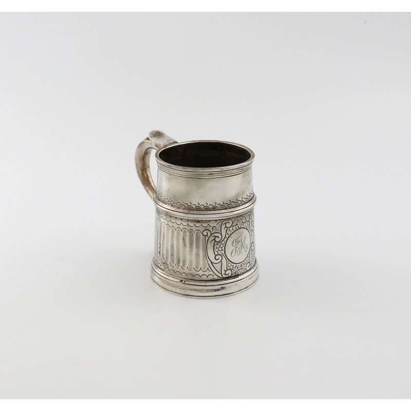 tapering circular form, in the Queen Anne manner, scroll handle with beaded decoration, initialled, height 9.3cm, approx. weight 7.2oz.