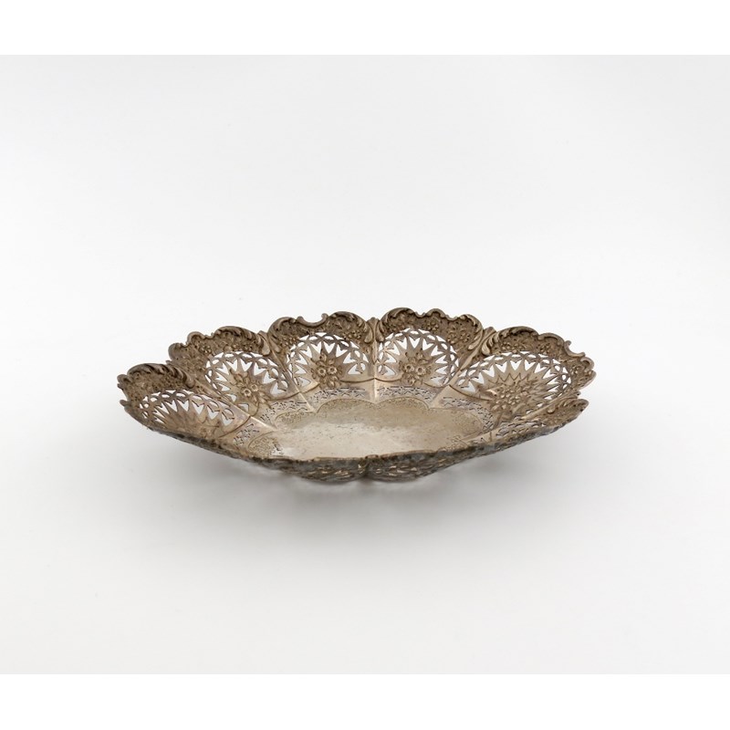 shaped oval form, pierced and embossed decoration, scroll border, length 28cm, approx. weight 11.2oz.