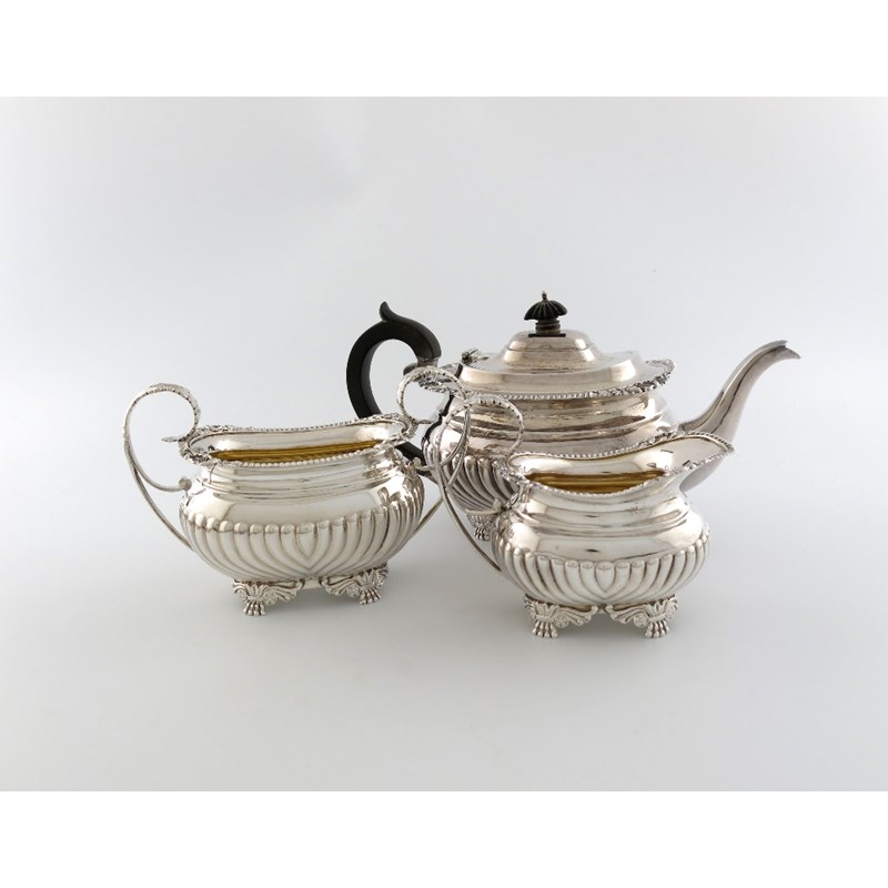 oblong bellied form, part fluted decoration, shell and gadroon borders, scroll handles, on four winged paw feet, length handle to spout 28.5cm, approx. weight 39oz. (3)