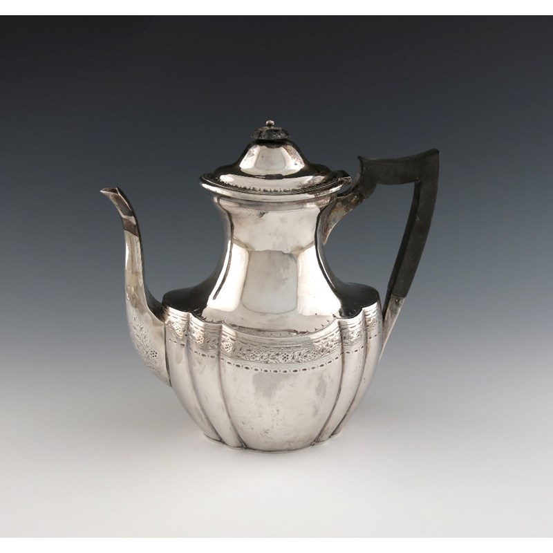 lobed oval form, engraved decoration, scroll handle, domed hinged cover, height 20cm, approx. weight 15oz.