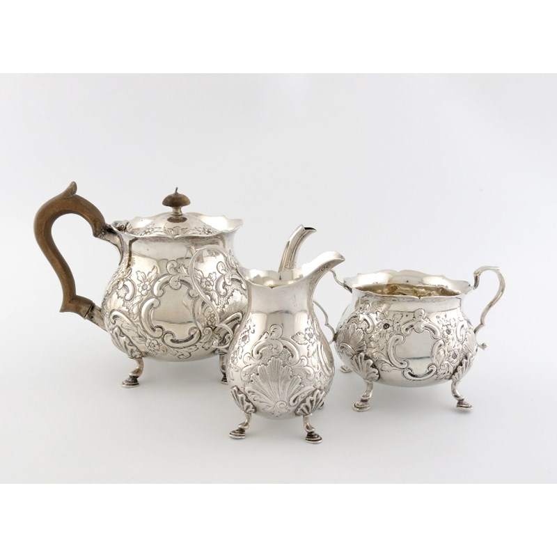 circular bellied form, embossed foliate scroll decoration, domed hinged cover with a knop finial, scroll handles, on four hoof feet, approx. weight 36oz. (3)