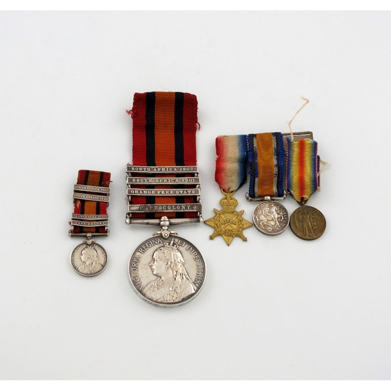 Boer War, Queen's South Africa Medal, 4 clasps, Cape Colony, Orange Free State, South Africa 1901 and 1902 (Capt. W. H. Burn. 6 Manch: Rgt), re-named, engraved slanting letters, name in caps; with dress miniature and World War I, miniature trio, 1914-15 Star. Very fine but clasps loose on both QSA and miniature.