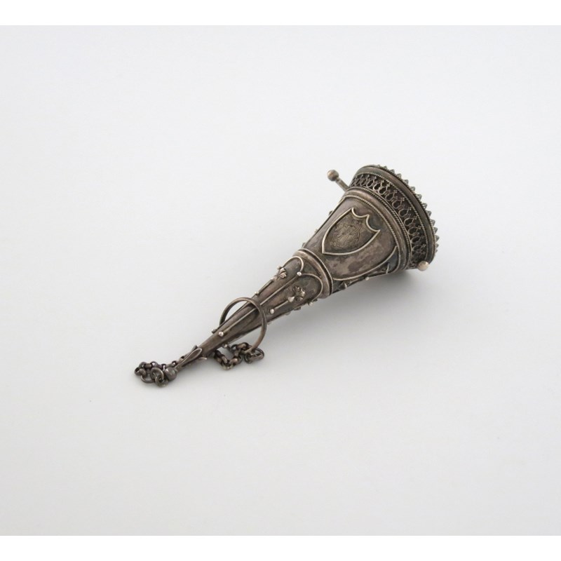 tapering circular form, with applied decoration on a matted background, with two pins and a chain and finger ring, engraved with a monogram and dated 1907, length 11.3cm, approx. weight 1.2oz.