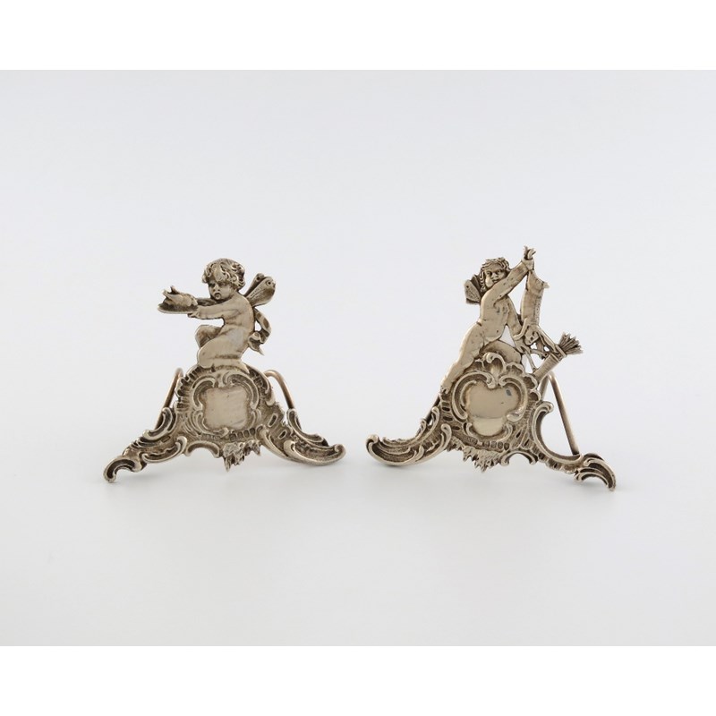 modelled as a cherub holding a hare and a cherub holding a cooked bird, on foliate scroll mounts with vacant cartouches, wire-work backs, height 6.2cm, approx. weight 1.6oz. (2)
