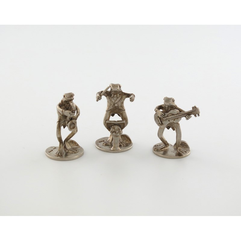 modelled as members of a frog band, with one playing a guitar, one playing a saxophone and one conducting, height of conductor 4.8cm, approx. weight 3oz. (3)