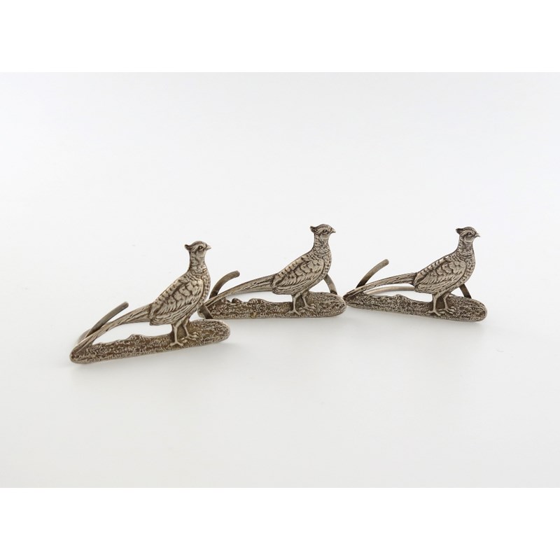 modelled as standing pheasants, semi-circular wire-work supports, length 6.4xm, approx. weight 1.7oz. (3)