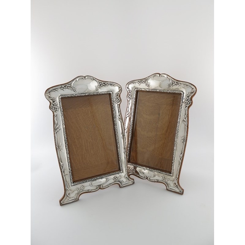 of upright rectangular form, foliate scroll decoration, vacant cartouches, on bracket feet, wooden easel backs with strut supports, height 38.5cm. (2)