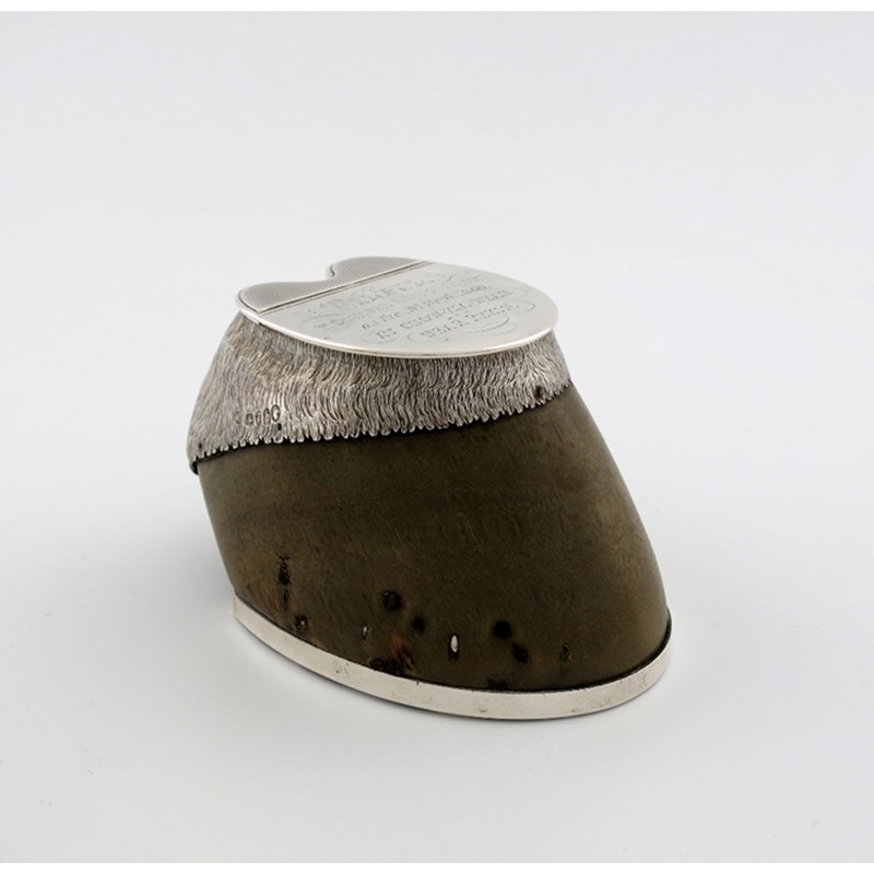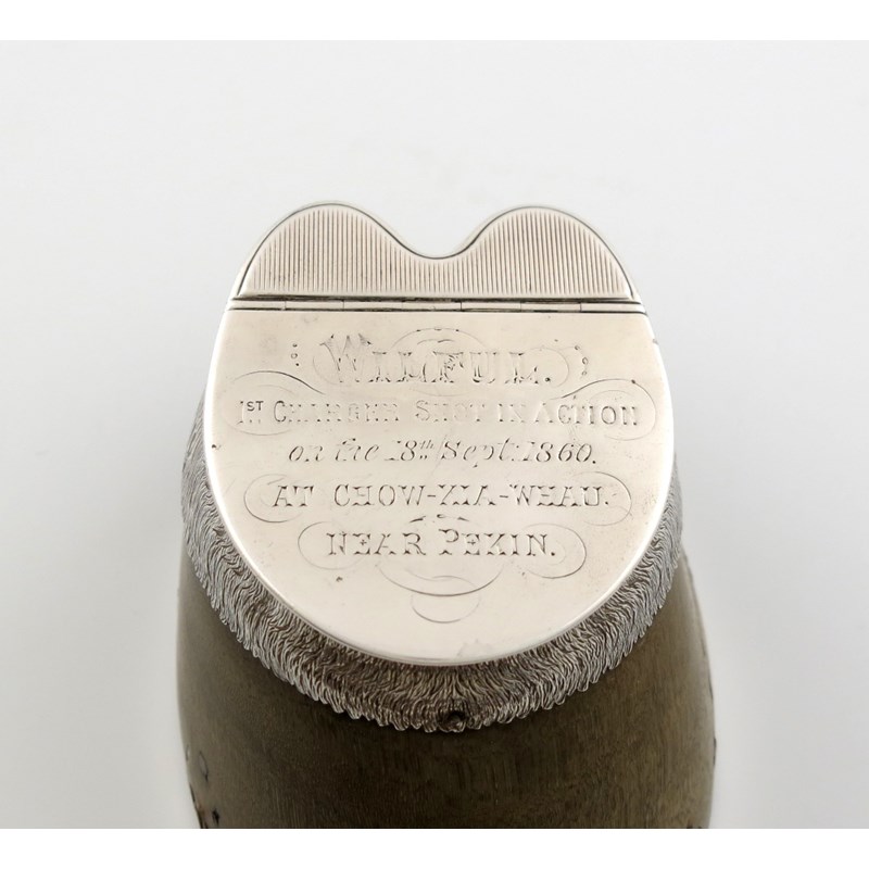the hoof with textured hair mounts and a striking plate, the hinged cover inscribed 'WILFUL, 1st Charger Shot in Action on the 18th September 1860 AT CHOW-KIA-WHAU NEAR PEKIN', on a silver horse shoe, length 12cm.