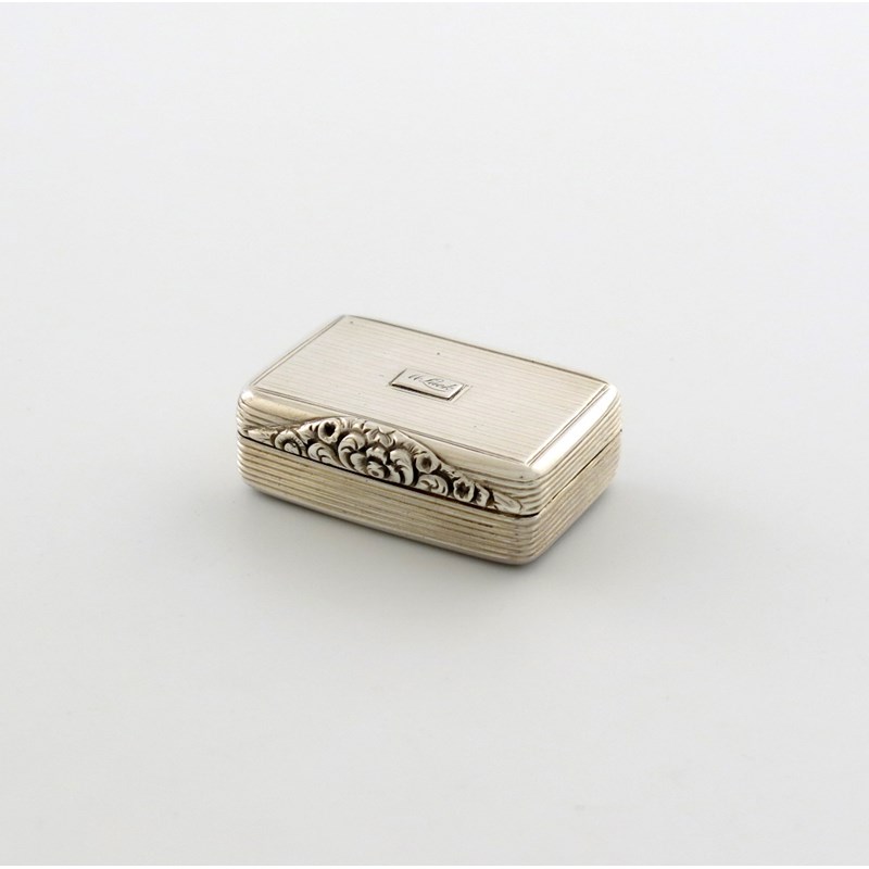 rectangular form, reeded decoration, foliate thumb-piece, the hinged grille pierced and engraved with a lyre and foliate scroll decoration, length 3.7cm, approx. weight 0.8oz.
