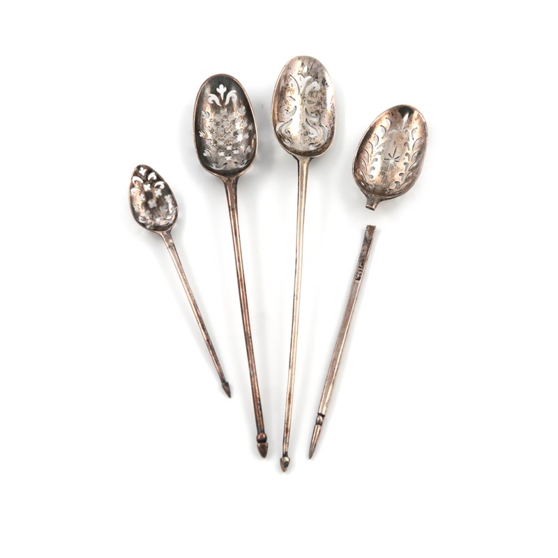 comprising: a miniature one with traces of a maker's mark, circa 1760, the oval bowl with pierced decoration, plus an early 18th century one marked 'W', the bowl with pierced scroll decoration, another with pierced mullets and one damaged, approx. weight 0.9oz. (4)