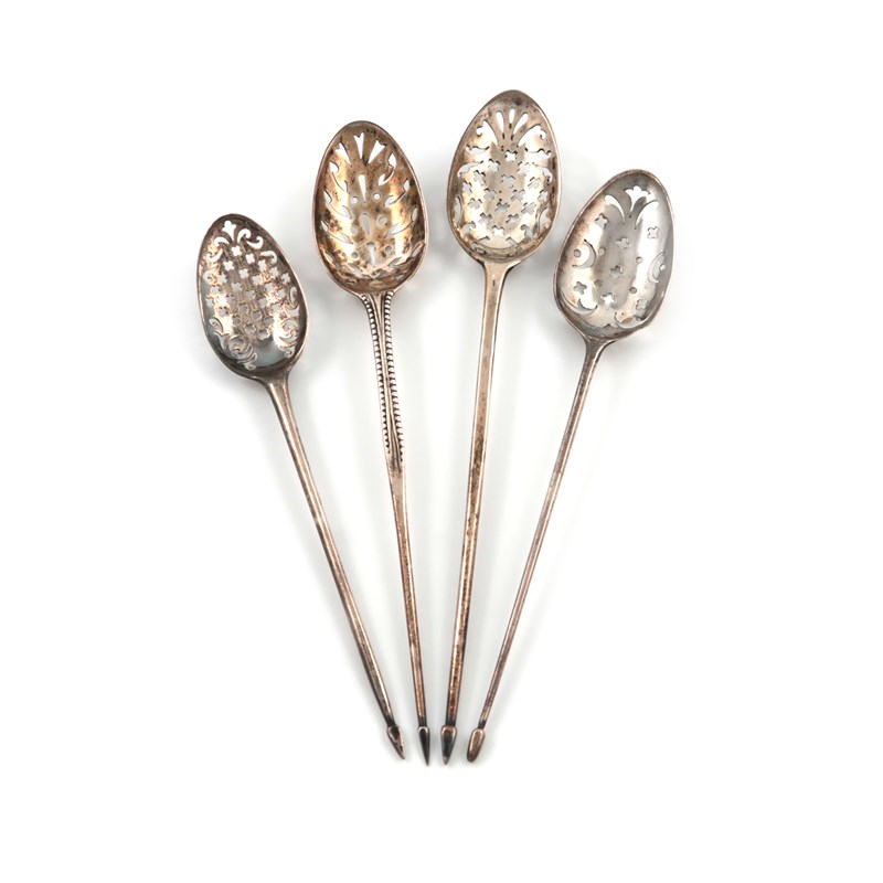 all with traces of maker's marks or lion passant mark, comprising: one pierced with mullets, the reverse of the bowl with scratch initials 'M' over 'R.L', two others pierced with scroll and mullets and one with beaded decoration, approx. weight 1.1oz. (4)