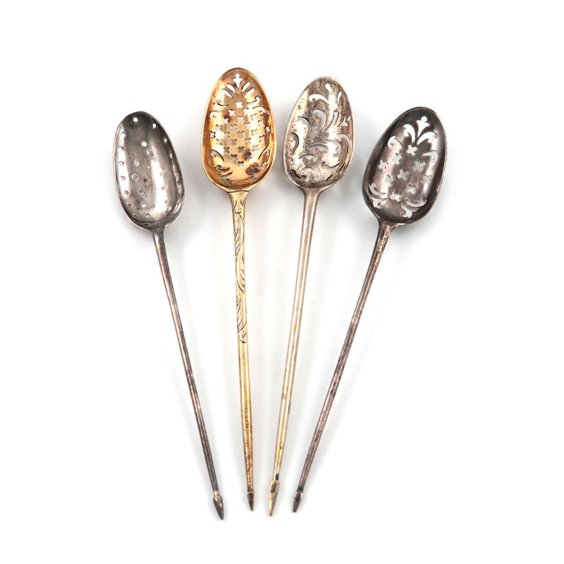 all with traces of marks, comprising: a silver-gilt one, the bowl pierced with mullets and scrolls, one with a shell motif to the reverse of the bowl, one with plain piercing and one with scroll piercing, approx. weight 1.2oz. (4)