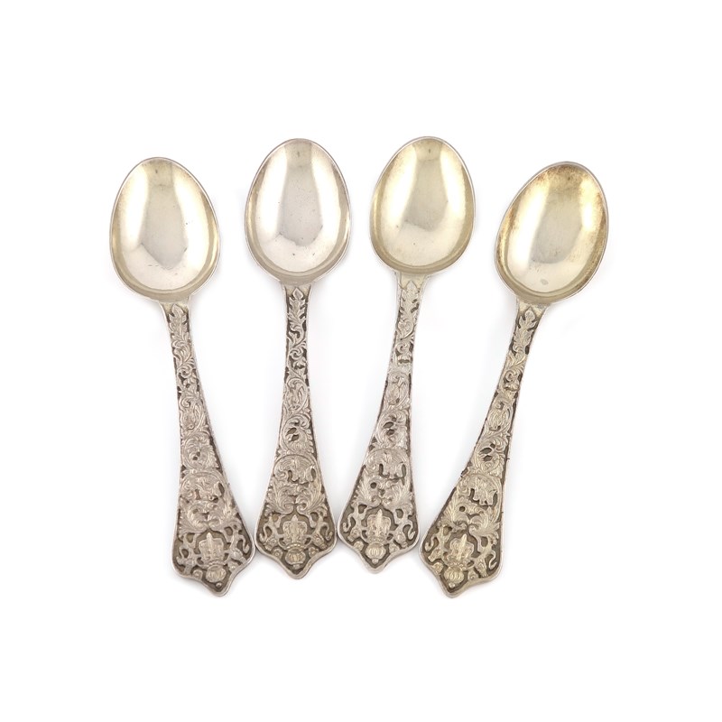 oval bowls, the reverse of the bowls with chased decoration and ribbed rat-tails, the terminals with armorials and foliate scroll decoration, length 19cm, approx. weight 10oz. (4)