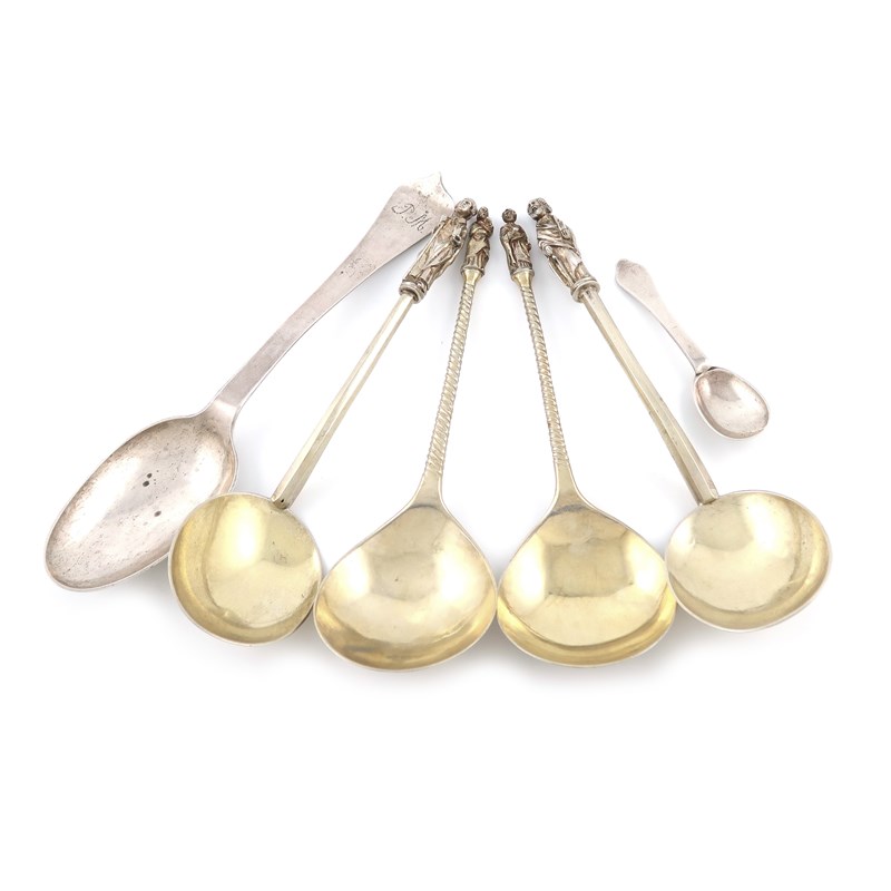 comprising: a Queen Anne Dog-nose condiment spoon, probably by John Ladyman, London circa 1710, a continental spoon, with script initials, plus two pairs of 19th century silver-gilt Apostle spoons, approx. weight 9oz. (6)