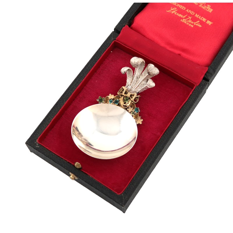 celebrating the birth of Prince Harry, circular bowl, the handle with The Prince of Wales Feathers, ribbon-tied with enamelled flowers, in a fitted case, length 7cm, approx. weight 0.7oz.
