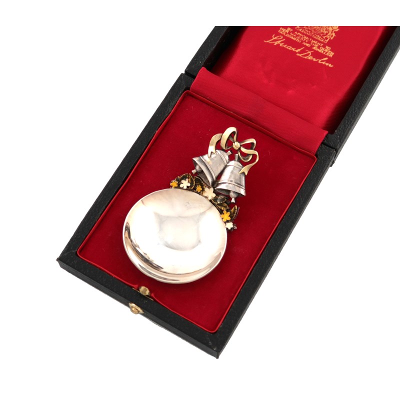 celebrating the Royal Wedding of Prince Andrew to Sarah Ferguson, circular bowl, the handle with ribbon-tied bells with enamelled flowers, in a fitted case, length 6.8cm, approx. weight 0.9oz.