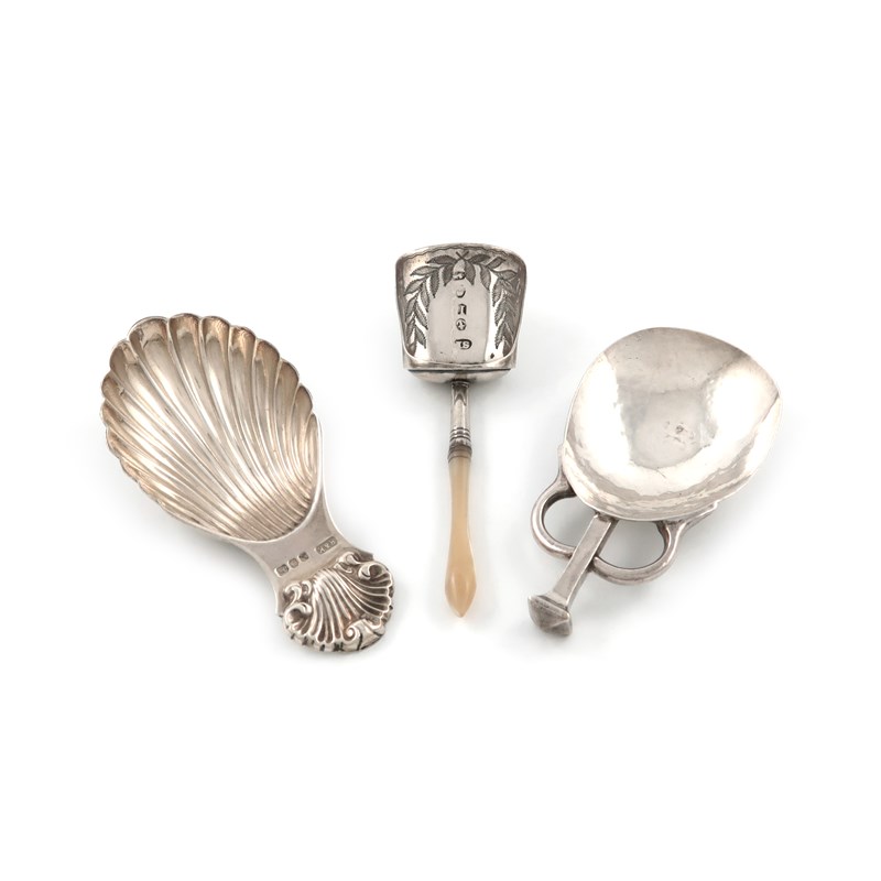 comprising: an Edwardian Arts and Crafts one, by The Cooper Brothers, Sheffield 1907, fig-shaped bowl, pierced scroll and hob-nail shaped handle, a George III shovel shaped caddy spoon, by Samuel Pemberton, Birmingham 1809, engraved decoration, mother-of-pearl handle, and a modern caddy spoon with a fluted shell bowl, approx. weight 1.5oz. (3)
