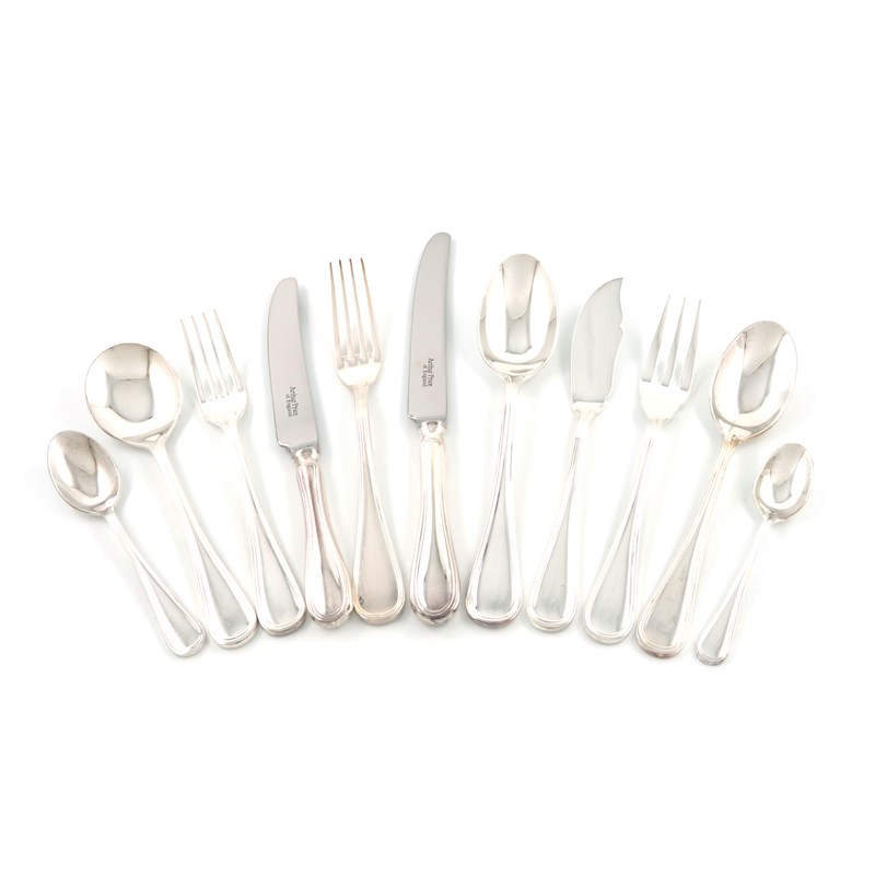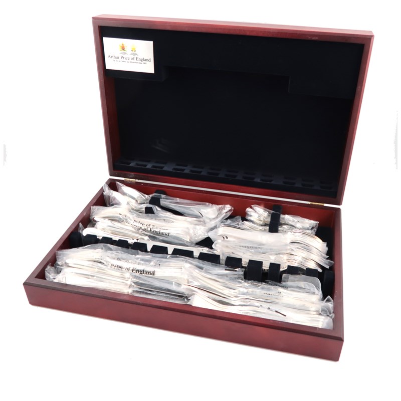 comprising: eight table knives, eight table forks, eight dessert knives, eight dessert forks, eight fish knives, eight fish forks, eight dessert spoons, eight soup spoons, four tablespoons, seven teaspoons and eight coffee spoons, in a fitted case.