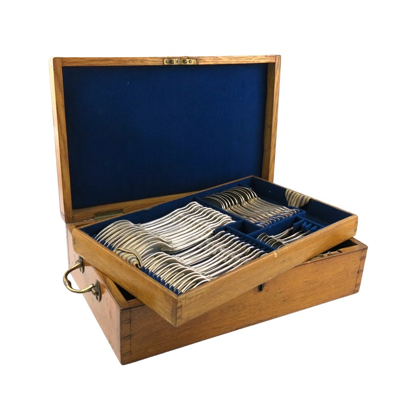 the terminals initialled, comprising: twelve table forks, twelve dessert forks, (two with different dates and makers), twelve teaspoons, twelve dessert spoons, twelve tablespoons, (six crested), and a pair of sauce ladles, plus other items by different makers: six modern soup spoons, six egg spoons, a sifting spoon, a pickle fork and chutney spoon, a butter knife and a cake knife, in a fitted wooden case, approx. weight 160oz. (qty)