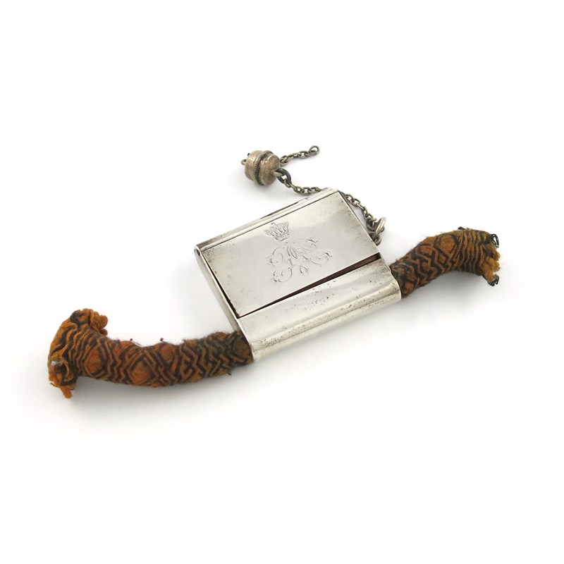 rectangular form, push-action opening mechanism, engraved with a crowned cipher, with a ring attachment, and burning cord, length 5cm, approx. weight 1.9oz.