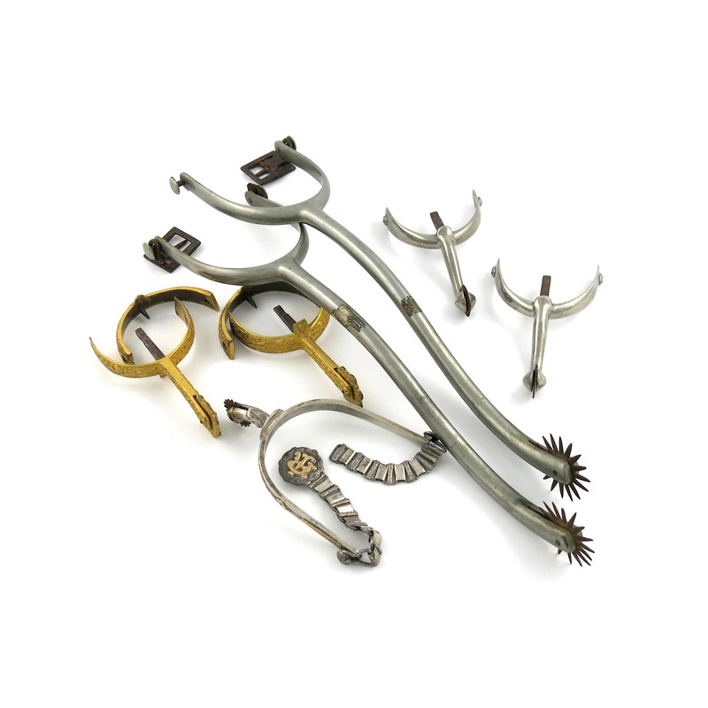 comprising: a single metalware spur, steel rowel, applied gilt decoration, with a chain and clip, initialled, plus a pair of gilt metal spurs with oak leaf decoration and foliate rowels, plus a pair of long metal spurs, possibly for an elephant or camel, and a smaller pair of metal spurs. (7)