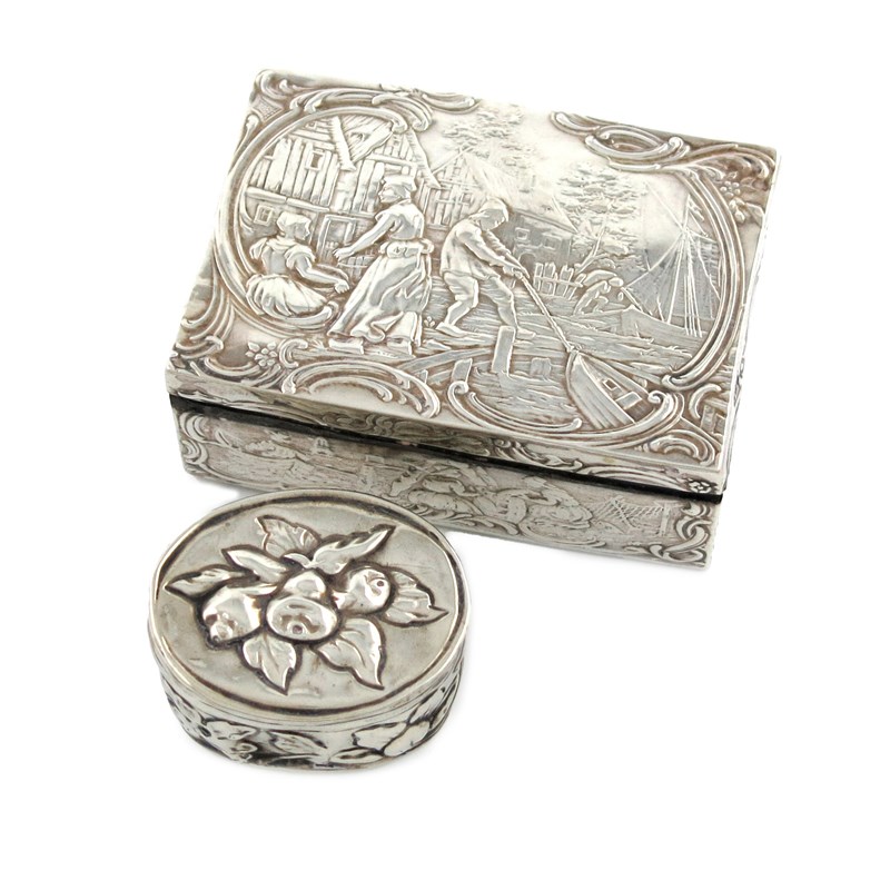 rectangular form, embossed with figural scenes, plus an unmarked silver box, possibly late 17th century, oval form, embossed with fruit and foliate decoration, the base engraved with an eagle, approx. weight 4.2oz. (2)