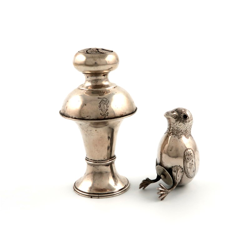 modelled as a chick emerging from an egg, plus a 19th century Austro-Hungarian pepper pot, 1830, circular tapering form, approx. weight 3.5oz. (2)