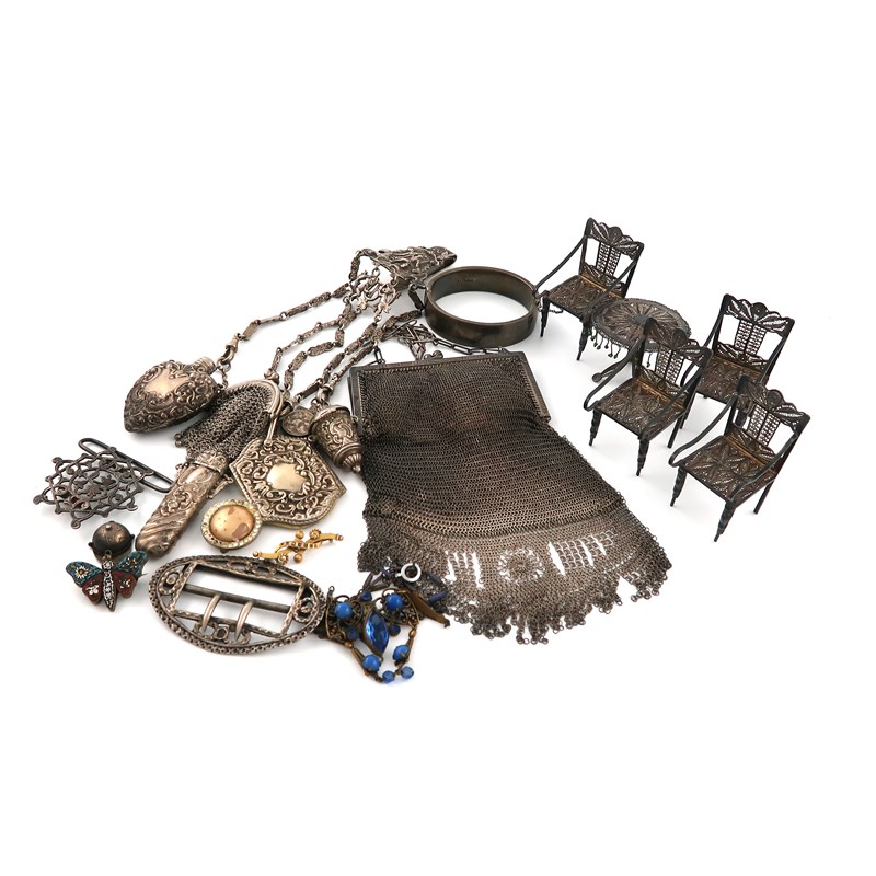 comprising: a chatelaine clip, Chester 1900, embossed figural and foliate scroll decoration, with five hanging chains and a scent bottle (lacking cover), a needle case, a thimble case, and aide memoire with ivorine pages, a purse and locket, plus a miniature filigree table and four chairs, an electroplated mesh bag, a buckle and other small items, approx. weighable 10oz. (qty)