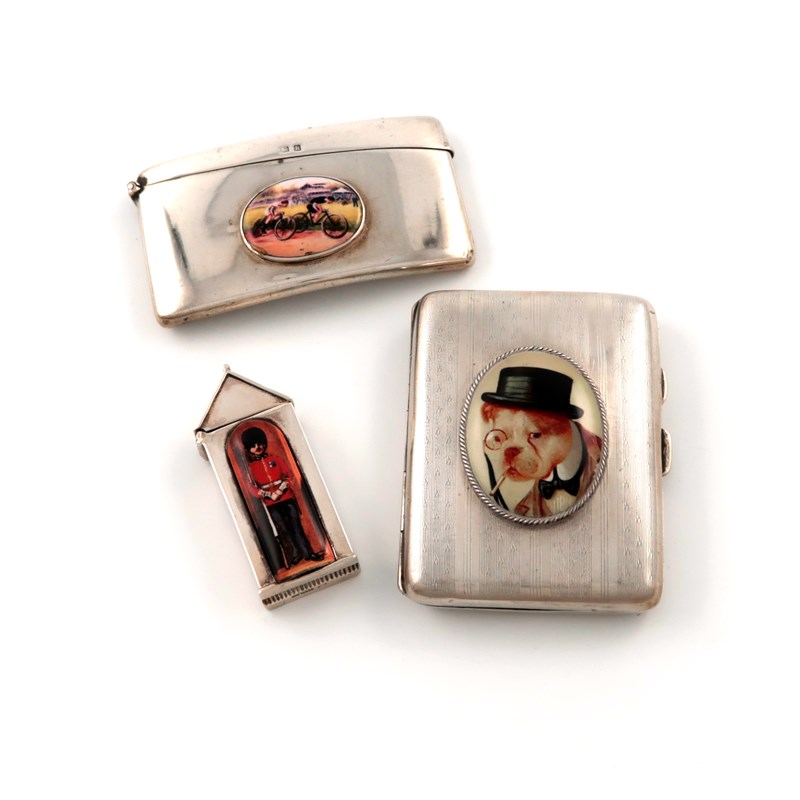 modelled as a sentry box, enamelled with a guardsman, plus a card case with a later enamel plaque of cyclists, and a cigarette case, with a later plaque of a bulldog wearing a hat and smoking. (3)