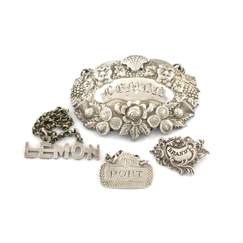 comprising: a miniature 'cut-out letters' label 'LEMON', by William Hutton and Sons, Sheffield 1913, one re-titled 'LEMON', plus one incised 'BRANDY' and 'PORT', approx. weighable 0.8oz. (4)