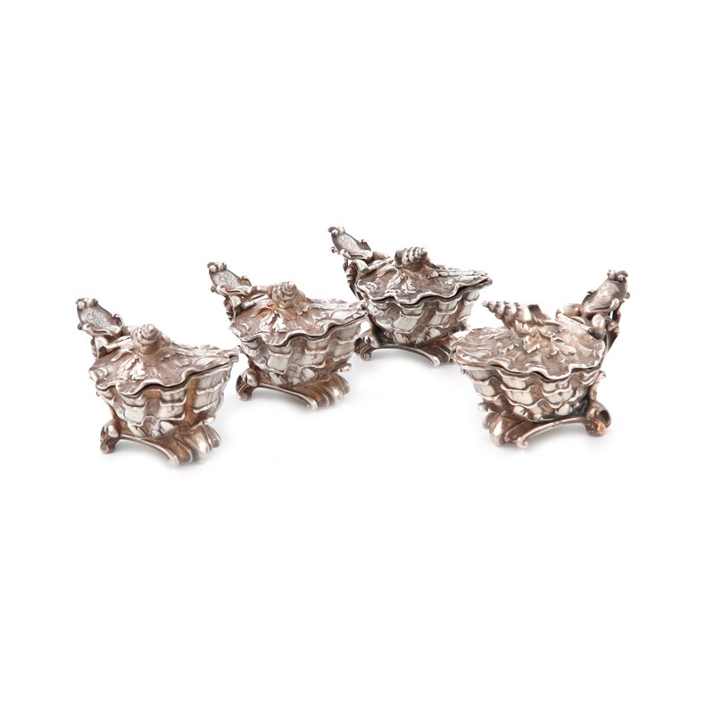 shell form, with hinged shell covers with a shell finial, gilded interiors, pierced foliate bifurcated scroll handle, initialled, on double scroll feet, length 8cm, approx. weight 20oz. (4)