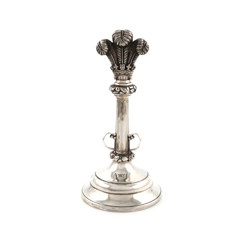tapering faceted form, with scroll mounts, the finial with Prince of Wales feathers, on a raised circular base, height 18.3cm, approx. weight 7oz.
