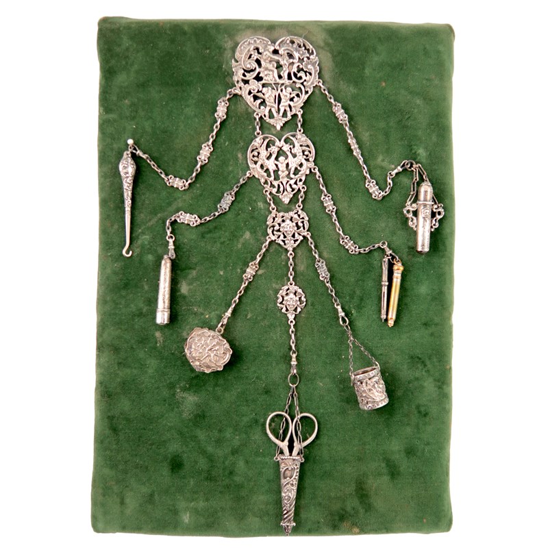 the clip of heart form, pierced foliate scroll decoration with cherubs. with six hanging chains, with a needle case, two pencils, a thimble holder and thimble, a pair of scissors, a pin wheel, a cigarette holder case, and a button hook, length 37cm.