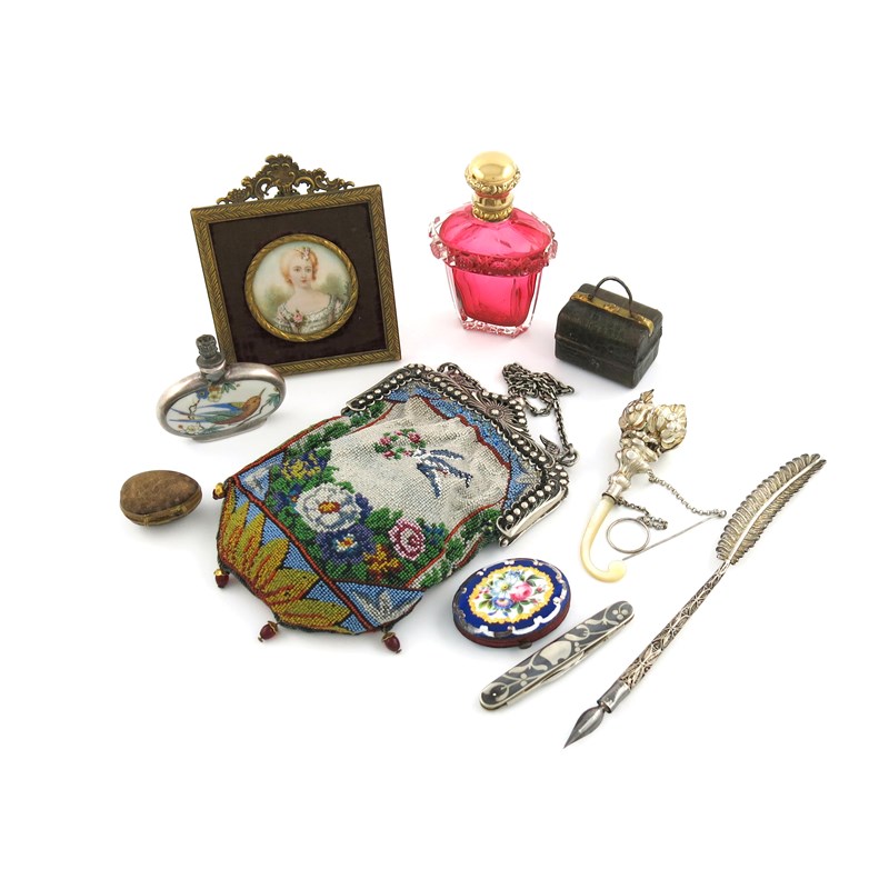 comprising a French gold-mounted red glass scent bottle, a posy holder, a travelling inkwell modelled as a Gladstone bag, a dip pen, an enamel purse, a thimble case, a niello-work penknife, a portrait miniature, a continental silver-mounted bead-work bag, with swans and beaded decoration, and a scent bottle. (10)