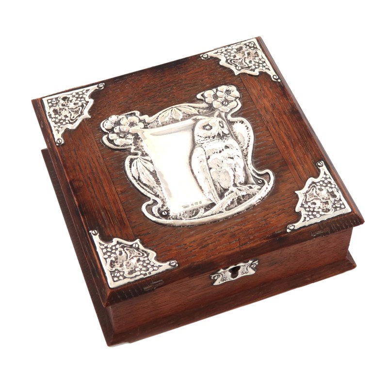 square form, the hinged cover applied with a panel of an owl within foliate decoration, the corners with foliate motifs, fitted velvet interior, length 15.3cm.