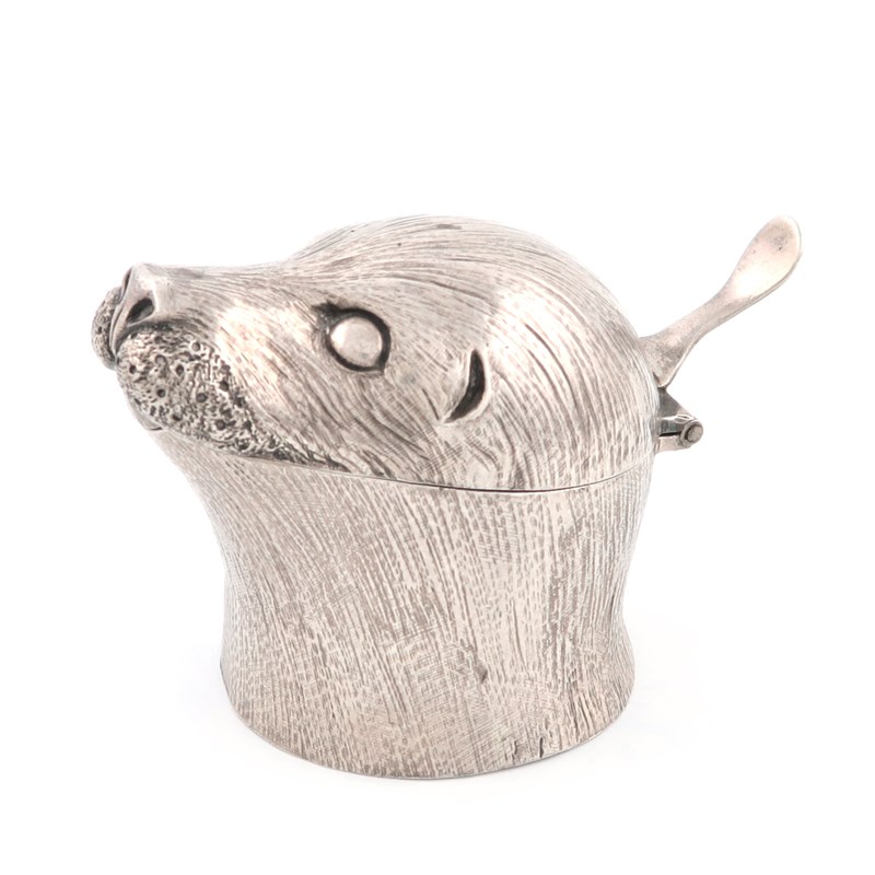 modelled as a seal's head, hinged cover with a plain thumb-piece, height 6cm, approx. weight 3oz.