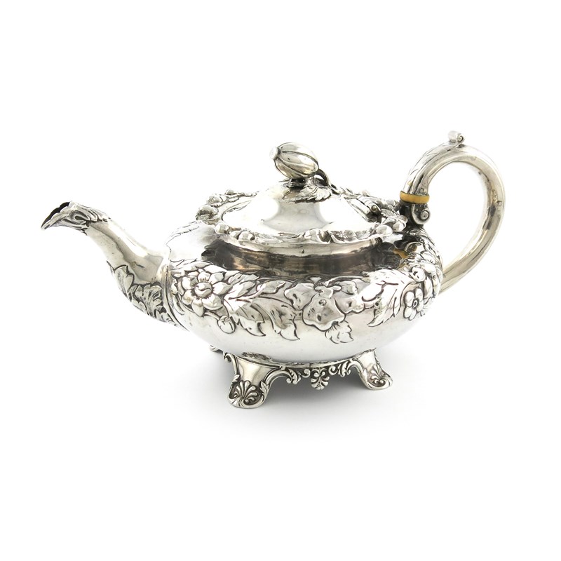 circular form, embossed foliate decoration, scroll handle with ivory insulators, the hinged cover with a gourd finial, on four shell bracket feet, length handle to spout 26cm, approx. weight 20oz.