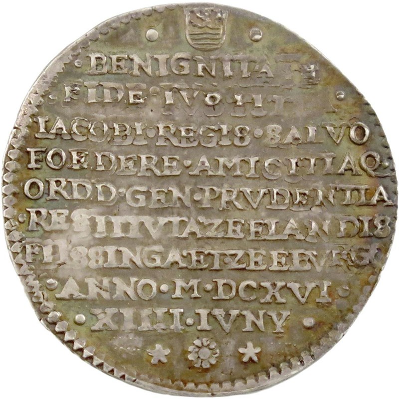 The Cautionary Towns restored, Dutch silver jeton, 1616, arms of seven Provinces linked around those of Zeeland and centre, ZEELANDIA, rev., legend in nine lines, BENIGNITATE FIDE IVSTITIA IACOBI REGIS …, 30mm, 6.32g (MI 214/59; vL II, 96; Dugn. 3723). Obverse extremely fine and reverse nearly so, showing signs of double striking.