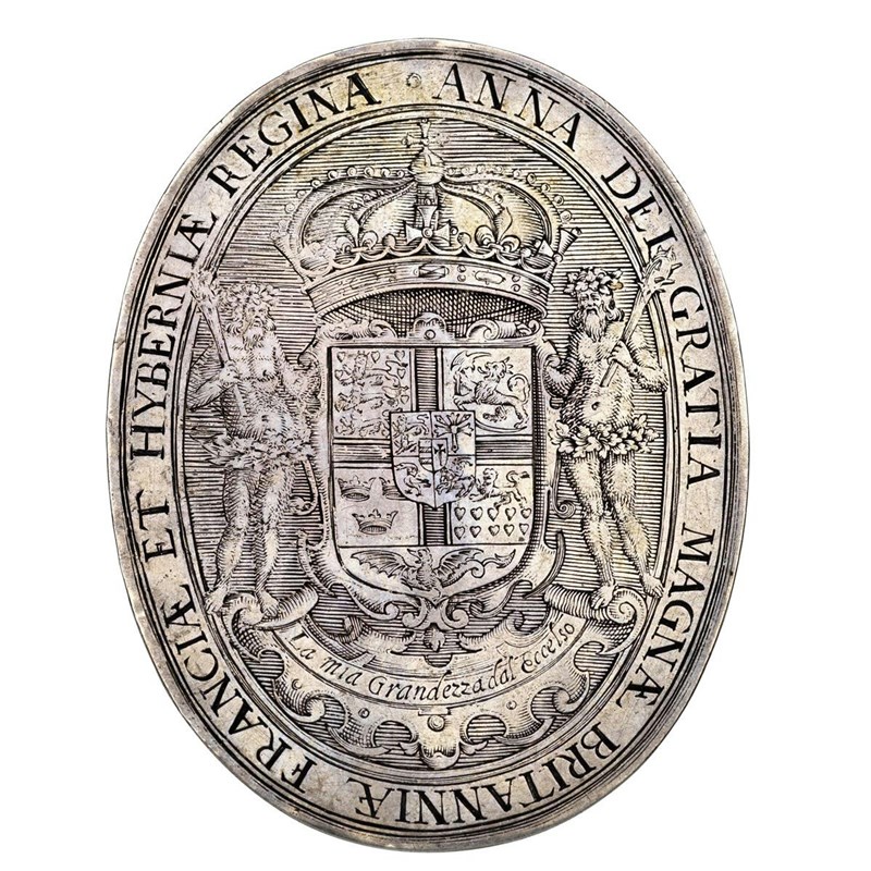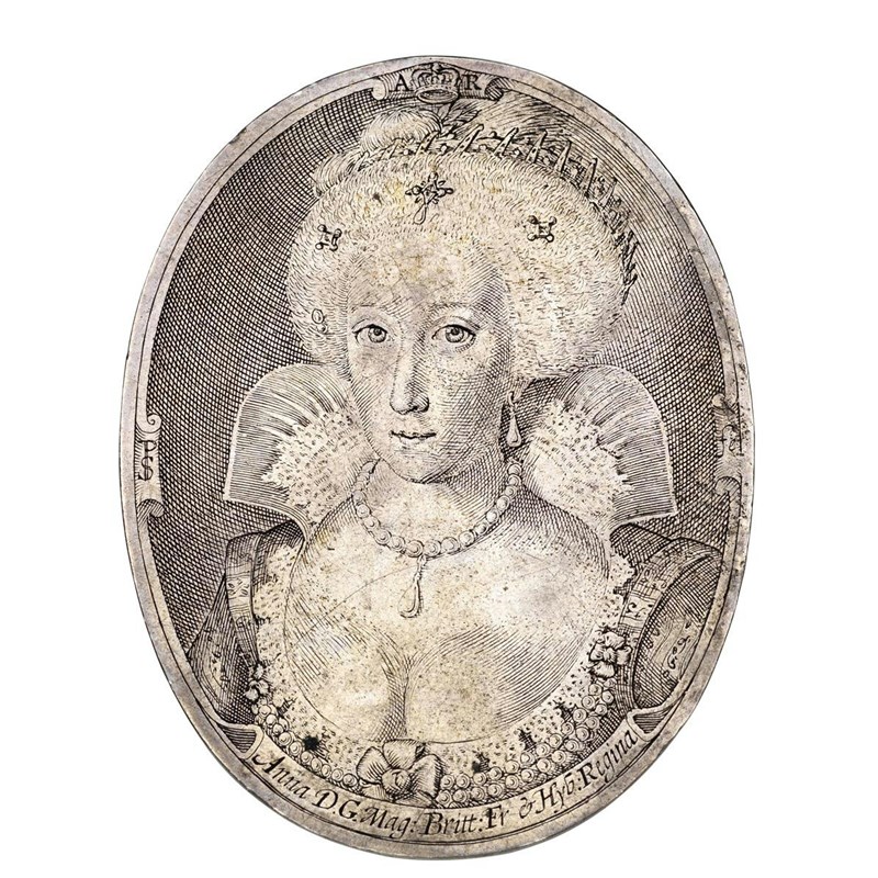 Queen Anne (1574-1619), oval silver portrait medal, by Simon de Passe, circa 1616, in imitation of engraving, signed SP (in monogram) fe, in border cartouches to left and right, bust of the Queen three-quarters left, her hair high and adorned with jewels, high collar, wearing pearl necklace and earring, crown dividing initials A R above, and on scroll below "Anna DG Mag Britt Fr & Hyb Regina", rev., crowned shield of Anne with wildmen supporters, motto in scroll below, "La mia Grandezza dal Eccelso", ANNA DEI GRATIA MAGNA BRITANNIÆ FRANCIÆ ET HYBERNIÆ REGINA, 55.5 x 43mm (MI 215/63; Rosenheim 590). Obverse somewhat rubbed, nearly very fine, reverse very fine, very rare.