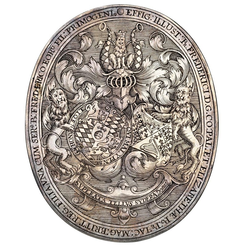 Frederick V (1596-1632), Count Palatine, Elizabeth Stuart (1596-1662) of Bohemia and their son Prince Henry Frederick (1614-1629), oval silver portrait medal by Simon de Passe, circa 1616, signed SP (in reversed monogram), busts of the Count, his wife the Princess and the infant Prince, all with lace collars, the Prince with lace bonnet, she with jewels in hair and with necklace, rev., two shields supported by lions, helm and two-tailed lion crest above, motto below SVPERATA TELLVS SYDERA Donat, legend around, EFFIG ILLUST PR FREDERICI DG CO PAL ET ELIZABETHÆ PO PR IAC MAG BRITT REG FILLIA, VNA CVM SERO PR FERDERICO EORU FIL PRIMOGENIto, 64 x 51 mm (MI 218/69; Stemper 161; Exter II, 368, 102u). Good very fine with light patination, extremely rare.