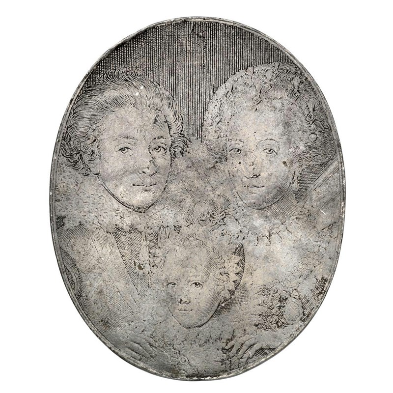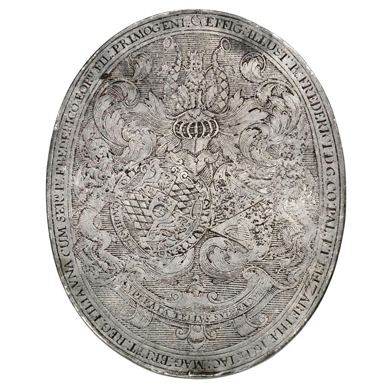 Frederick V (1596-1632), Count Palatine, Elizabeth Stuart (1596-1662) of Bohemia and their son Prince Henry Frederick (1614-1629), oval tin or pewter (or perhaps base silver) portrait medal by Simon de Passe, circa 1616, signed SP (in reversed monogram), busts of the Count, his wife the Princess and the infant Prince, all with lace collars, the Prince with lace bonnet, she with jewels in hair and with necklace, rev., two shields supported by lions, helm and two-tailed lion crest above, motto below SVPERATA TELLVS SYDERA Donat, legend around, EFFIG ILLUST PR FREDERICI DG CO PAL ET ELIZABETHÆ PO PR IAC MAG BRITT REG FILLIA, VNA CVM SERO PR FERDERICO EORU FIL PRIMOGENIto, 63.5 x 51 mm (MI 218/69; Stemper 161; Exter II, 368, 102u). Very fine or nearly so, flan a little uneven and marked.