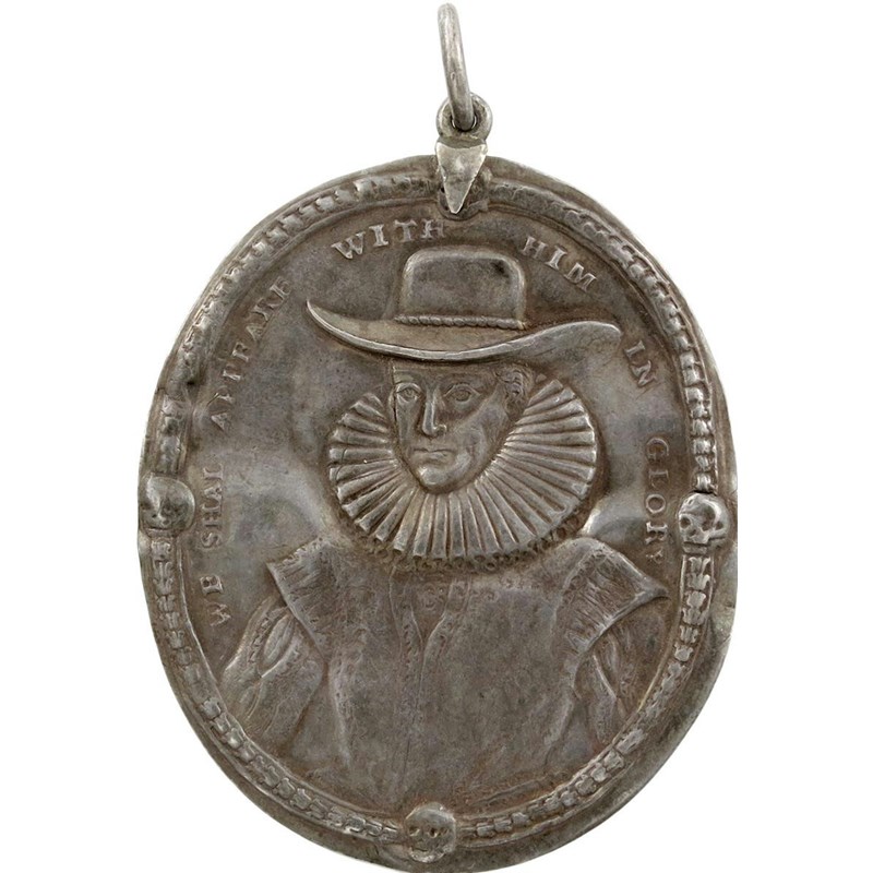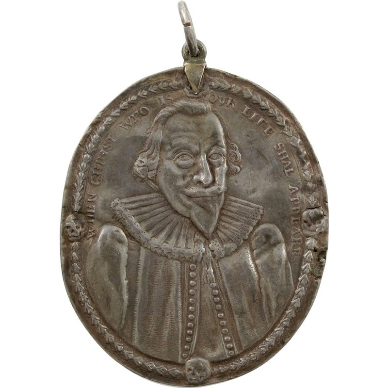 Nicholas and Dorothy Wadham, founders of the Oxford College that has their name, hollow oval silver medal, 1618, made of two clichés joined at the rim, his half-length bust three-quarters right, with ruff collar over plain cloak, WHEN CHRIST WHO IS OVR LIFE SHAL APPEARE, rev., her half-length bust three-quarters left, wearing damask gown, high ruff collar and broad-brimmed hat, WE SHALL APPEARE WITH HIM IN GLORY, 60 x 46.5mm (MI 220/73; Eim. 98; H & P pl. 28, 10). A little crimped, very fine and rare.