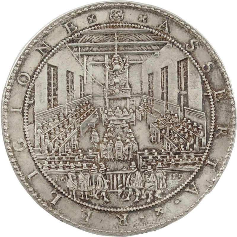 The Synod of Dort [Dordtrecht], silver medal, 1619, by W. van Bijlaer, a variety, panoramic view of the long chamber at Dordrecht with the Council assembled, date only on barrier, ASSERTA RELIGIONE, rev., pilgrims ascend a hill, on which the temple of heaven is attacked by the four winds, the name יְהֹוָה radiates from above, ERVNT VT MONS SION, 58mm (MI 223/78; vL II, 105; Eim. 99). Choice extremely fine.