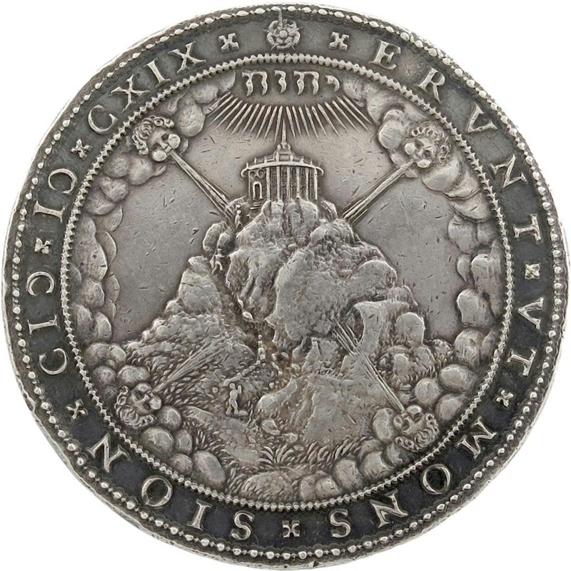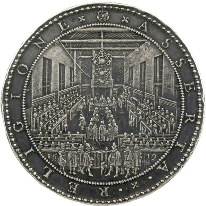The Synod of Dort [Dordtrecht], silver medal, 1619, by W. van Bijlaer, similar variety, panoramic view of the long chamber at Dordrecht with the Council assembled, date only on barrier, ASSERTA RELIGIONE, rev., pilgrims ascend a hill, on which the temple of heaven is attacked by the four winds, the name יְהֹוָה radiates from above, ERVNT VT MONS SION, 58mm (MI 223/78; vL II, 105; Eim. 99). Almost extremely fine, toned.