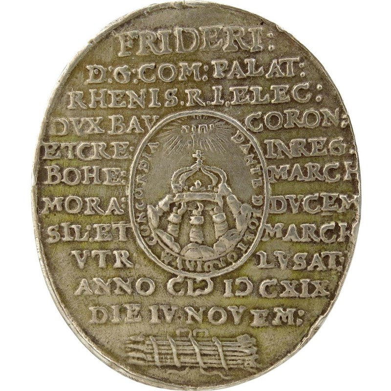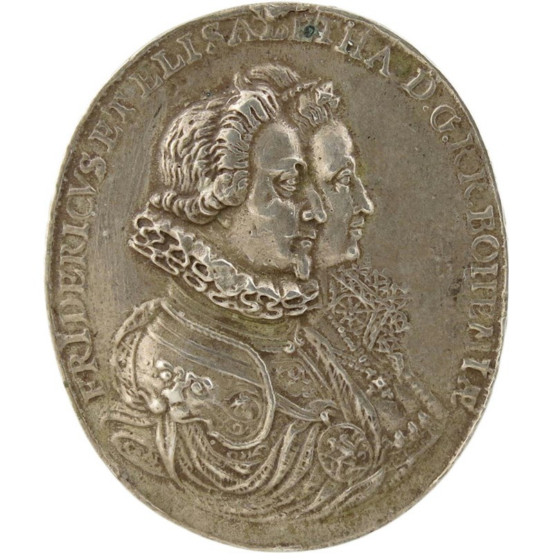 Frederick V (1596-1632) and Elizabeth Stuart (1596-1662) of Bohemia, Coronation as king of Bohemia, silver medal, 1619, by Christian Maler [Nürnberg], conjoined busts right, he in armour and with ruff collar, wearing Garter George, she withhigh lace collar, rev., central oval medallion, with five hands supporting crown, placed on legend, FRIDERI DG COM PALAT …, bundle of tied arrows below, 40 x 33.5mm (MI 225/82; Stemper 162; Don. 2034; Memmesheimer 2264). Very fine and rare.