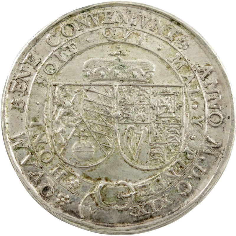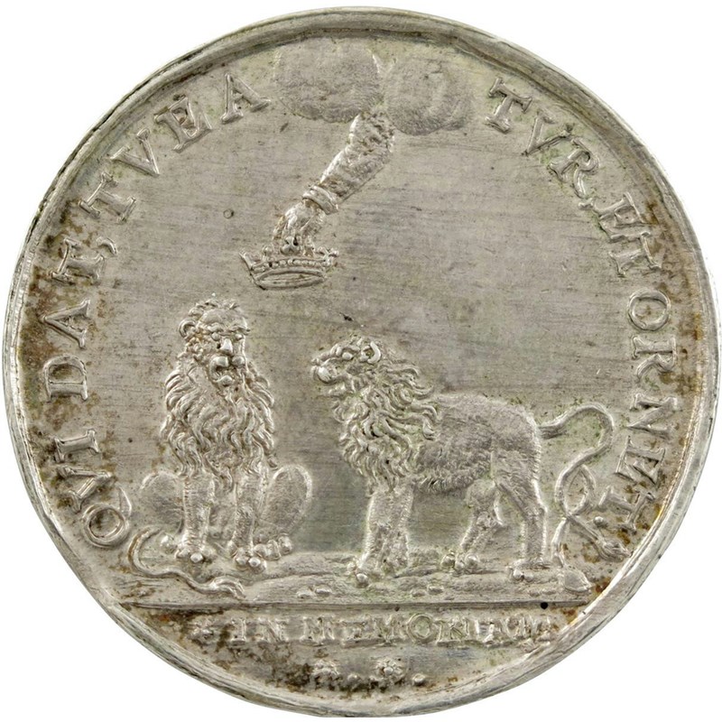 Frederick V (1596-1632) and Elizabeth Stuart (1596-1662) of Bohemia, Coronation as king of Bohemia, silver medal, 1619, by Christian Maler [Nürnberg], hand from heaven holds crown over seated lion, another, with double-tail, stands to right, QVI DAT TVEATVR ET ORNET, in ex. IN MEMORIAM, rev., linked shields of arms within Garter, QVAM BENE CONVENIVNT ANNO M D C XIX, 33mm (MI 226/85; Stemper 169; Exter I, 89, 94; Donebauer 2029; Northumberland II, 222). Extremely fine and very rare.