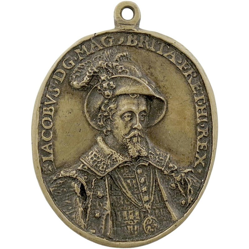 James I, Naval Reward, the 'Ark Badge', c. 1620, cast bronze medal, possibly by Nicholas Hilliard, half-length armoured bust of James I three-quarters right, wearing Garter robes and George on ribbon, lace collar and large plumed hat, + IACOBVS DG MAG BRITA FR ET HI REX, rev., smoke rises from chimney on Noah's Ark as it drifts on a wavy sea, + STET SALVVS IN VNDIS, 56.5 x 43.5mm (MI 233/95; cf. Eim. 101A), integral suspension loop. An old cast, very fine and very rare.