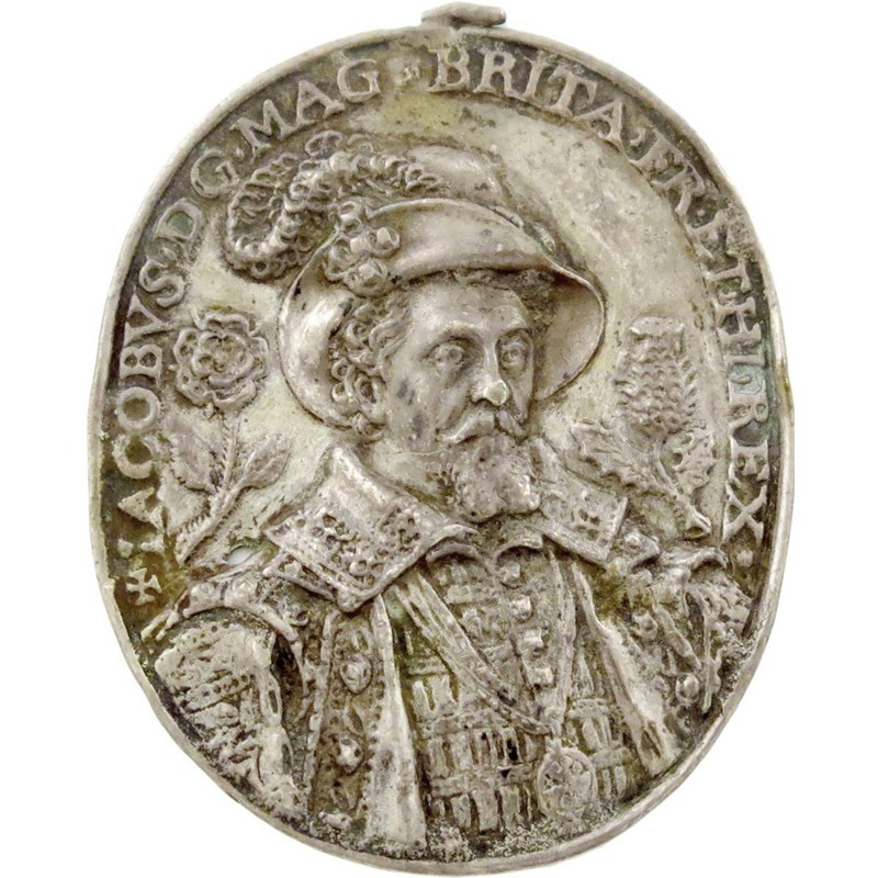 James I, presentation badge, uniface cast silver medal, c. 1624, bust of James I three-quarters right, wearing wide-brimmed plumed hat, to left a rose, to right a thistle, 51.5 x 41.5mm (MI -; cf MI 233/95 and 96 for varieties). Very fine, minute casting hole beneath the rose, very rare.